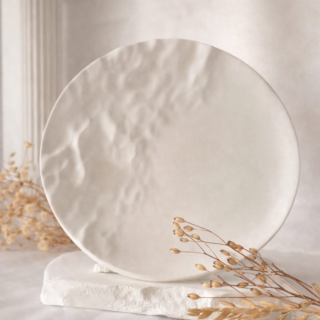 Sa surface subtilement irrégulière évoque la matière minérale et la pierre travaillée avec le temps, offrant un jeu de textures doux et naturel.
